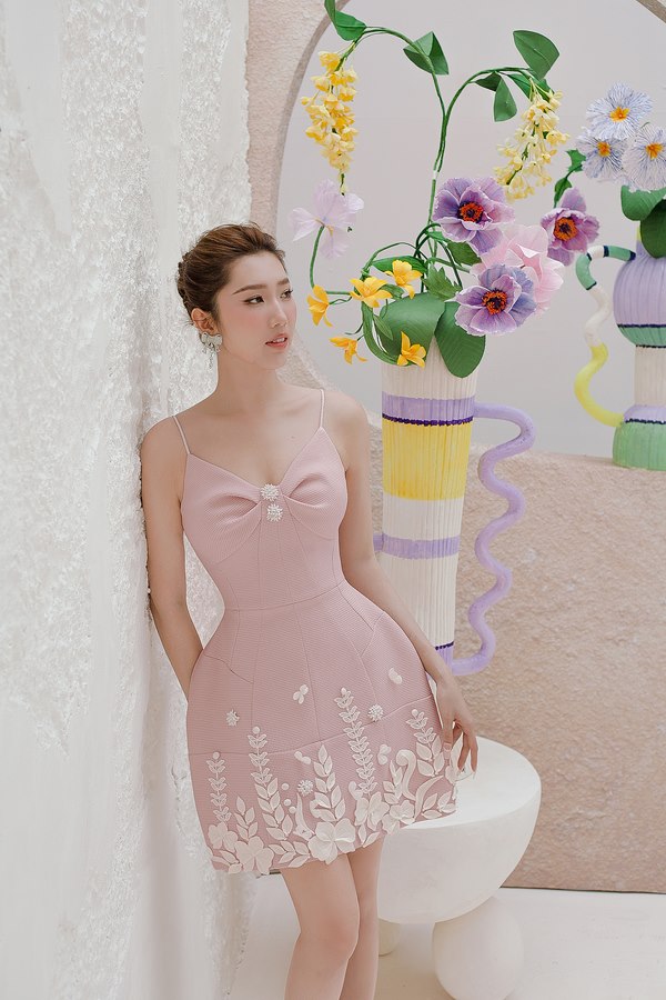 Hơn nữa, người đẹp còn khoác lên mình bộ váy đầy hơi thở mùa xuân với các đóa hoa đủ màu sắc được thêu tay trên nền vải trắng và tím. Hoa nở rộ ngay tại thân áo, rồi chạy dọc xuống hai bên đường chân váy, khiến người xem không thể nào rời mắt. Đặc biệt, nữ diễn viên yêu kiều mặc một chiếc váy hai dây màu hồng pastel, ngọt ngào và đủ sức lay động. Trong khúc giao mùa đang đến, cô uyển chuyển trong từng bước đi với thiết kế ôm trọn eo và váy có độ bồng bềnh nhẹ nhàng.