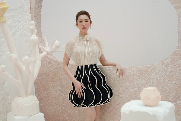 Cùng với lối make-up trong trẻo, tông cam – hồng nhẹ nhàng, Thúy Ngân tỏa sáng trong những thiết kế đầm thanh lịch, đính những chi tiết hoa tinh tiết.