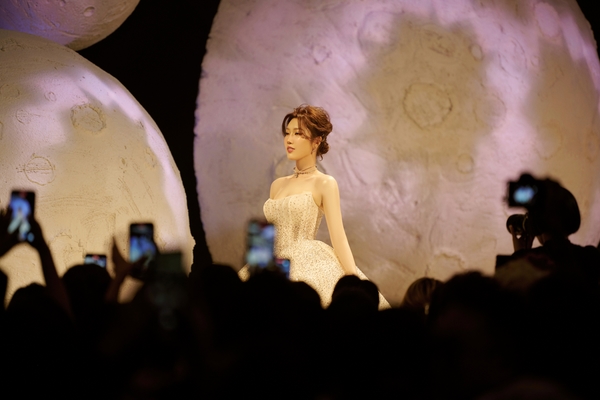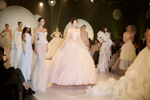 Đảm nhiệm vị trí First Face mở màn, Thúy Ngân xinh đẹp trong thiết kế rất đặc biệt, cô xuất hiện như nàng lọ lem – Cinderella đời thật, phần thân váy được mapping rực rỡ, khiến cô trở nên vô cùng lộng lẫy.