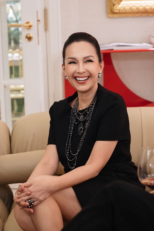 Doanh nhân Phượng Nguyễn diện trang phục vải tweed của Dior, kết hợp túi Hermès Birkin. Dù bận rộn, chị vẫn dành thời gian đến chúc mừng người em thân thiết – NTK Đỗ Mạnh Cường, người từng thực hiện nhiều thiết kế độc bản dành riêng cho chị trong sự nghiệp.