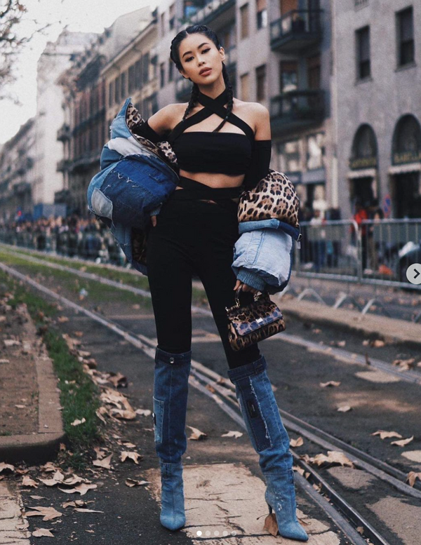 Cũng với tông đen, Tiên Nguyễn tiếp tục khoe trọn thần thái đỉnh cao khi xuất hiện tại show của Dolce&Gabbana. Cô diện trang phục jean phối họa tiết da thú thời thượng. Trước đó, trong tiệc tối của nhà mốt Ý, nữ doanh nhân diện set đen xuyên thấu vô cùng quyến rũ.
