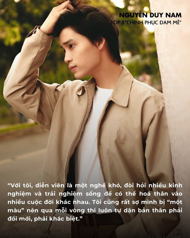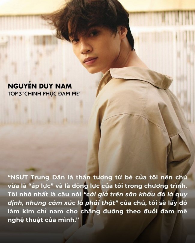 Với kinh nghiệm từng trình diễn tại sân khấu kịch, tham gia nhiều dự án phim, thí sinh Nguyễn Duy Nam đã thành công chinh phục khán giả và ban giám khảo bằng tài năng và thực lực của mình qua mỗi vòng thi, khép lại hành trình tại “Chinh phục đam mê” với vị trí Top 3 chung cuộc.