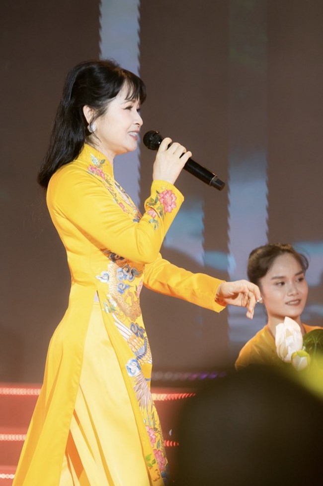 Trong tà áo dài truyền thống, nữ ca sĩ Trang Nhung mang đến hình ảnh dịu dàng và duyên dáng khi góp mặt tại chương trình nghệ thuật âm nhạc Vesak Rạng Ngời được tổ chức Nhân dịp Đại lễ Vesak Liên Hợp Quốc 2025 tại TP Hồ Chí Minh.