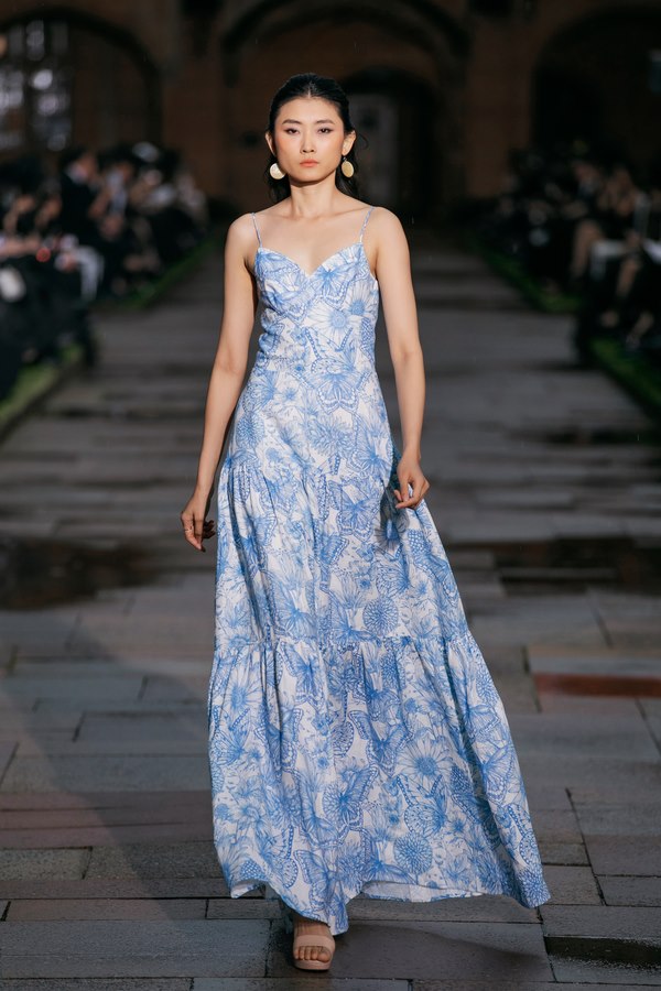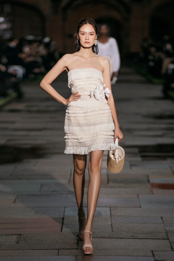 Á hậu Kim Duyên mở màn cho phần trình diễn này với thiết kế có hoạ tiết màu cam trên nền đen, với đường xẻ ở chân sâu hút. Siêu mẫu Minh Tú khép màn với dáng váy dài trễ vai.