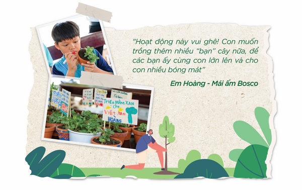 “Hoạt động này vui ghê! Con muốn trồng thêm nhiều “bạn” cây nữa, để các bạn ấy cùng con lớn lên và cho con nhiều bóng mát”, em Hoàng – thuộc mái ấm Bosco chia sẻ với nụ cười rạng rỡ. GREENFEED tin rằng, chính từ những trải nghiệm tự tay gieo trồng, chăm bẵm mầm sống bé nhỏ, các em sẽ cảm nhận được vẻ đẹp diệu kì của thiên nhiên, thấu hiểu hơn giá trị của môi trường và vun trồng trong tim mình tình yêu với thiên nhiên, với cỏ cây xung quanh. Từ đó, gieo mầm ý thức sống xanh, sống lành cho thế hệ mầm non, cùng chung tay xây dựng một Việt Nam Xanh tươi đẹp và bền vững.