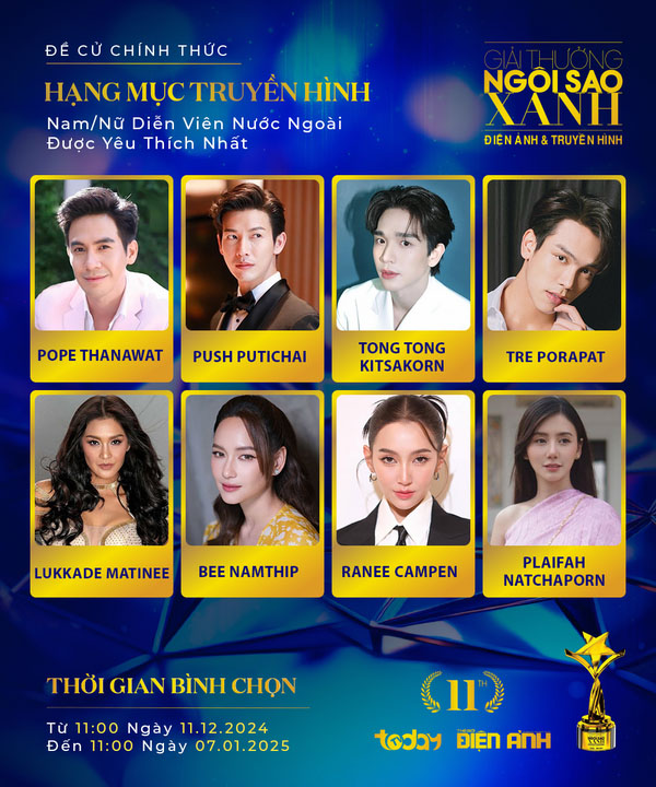 Năm nay, Ngôi Sao Xanh vẫn là sân chơi đầy gay cấn của những bộ phim và dàn diễn viên nước ngoài nổi bật nhất. Các bộ phim truyền hình của Thái Lan, Ấn Độ, Trung Quốc có nội dung hấp dẫn, mới mẻ chiếm sóng khung giờ vàng trên TodayTV và được đông đảo khán giả Việt đón nhận, yêu thích chính thức lọt vào đề cử Ngôi Sao Xanh 2024, đó là: Tình người duyên ma, Ngược dòng thời gian để yêu anh phần 2, Showbiz đại chiến, Thanh mai trúc mã, Lỡ yêu người thừa kế, Vệ nữ viên ngọc thần, Em biết em yêu anh,… Fan hâm mộ Việt cũng háo hức đón đợi những ‘thần tượng’ quốc tế đình đám tại đề cử giải thưởng năm nay như: Jirayu La-ongmanee, Push Puttichai, Tong Tong Kitsakorn, Pope Thanawat, Adhvik Mahajan, Ranee Campen, Bee Namthip, Lukkade Metinee, Nyra Banerjee hay Nutchaporn Ounsawad,… đâu sẽ là những cái tên vàng tiếp theo đến Việt Nam tham dự đêm gala trao giải đầy danh giá.