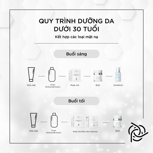 - Buổi tối: Rửa mặt – Toner (không bắt buộc) – Mặt nạ HA/Bio-Cellulose – R.H.C