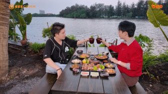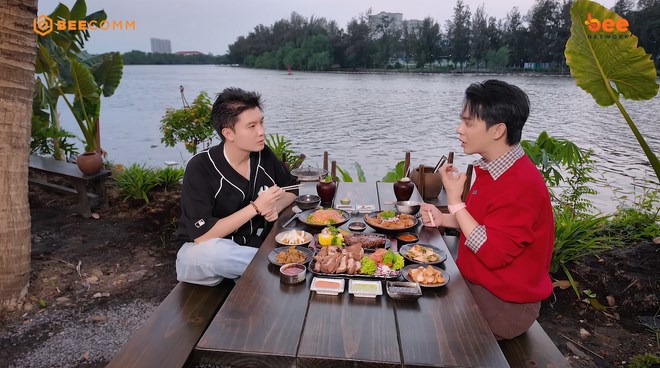 Bước vào bên trong, Tuấn Kiệt và Bi Max lựa chọn một góc yên tĩnh để trải nghiệm. Không gian cạnh bờ sông, bao quanh bởi nhiều cây xanh, mang đến sự mát mẻ nhờ làn gió tự nhiên, giúp bữa ăn thêm phần thư thái và dễ chịu.