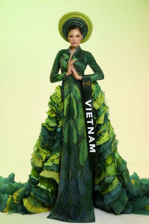 Mới đây, Vân Anh đã tung ra hai bộ ảnh diện trang phục dân tộc trước thềm chung kết Miss Earth 2021. Đúng như hứa hẹn trước đó, chân dài gốc Hưng Yên lựa chọn áo dài là National Costume từ La Sen Vũ – NTK Vũ Lan Anh để một lần nữa quảng bá nét đẹp trong bộ trang phục truyền thống của người phụ nữ Việt Nam đến với bạn bè quốc tế. Diện trên mình bộ áo dài kết hợp giữa phom dáng quen thuộc cùng phần tà được sáng tạo qua kỹ thuật xếp ly, tạo nhiều tầng ấn tượng, cầu kỳ, Vân Anh vừa khoe được vẻ đẹp duyên dáng, dịu dàng vừa toát lên vẻ cuốn hút, quyền lực. Bộ trang phục dân tộc của đại diện Việt Nam tại Miss Earth còn hút mắt bởi hiệu ứng chuyển màu xanh độc đáo, kỹ thuật phối hợp nhiều chất liệu và phần đính kết, tạo hiệu ứng bắt sáng.