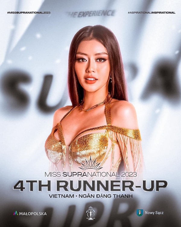 Đại diện Việt Nam, “Ngôi sao danh vọng- Leading Stars” Đặng Thanh Ngân đã khiến người hâm mộ bất ngờ với sự bứt phá ngoạn mục trong trình diễn ở đêm Chung kết và vỡ oà khi cô được xướng tên ngôi vị Á hậu 4 Miss Supranational 2023. Cô là đại diện Việt Nam đạt thành tích cao thứ ba trong lịch sử Miss Supranational.