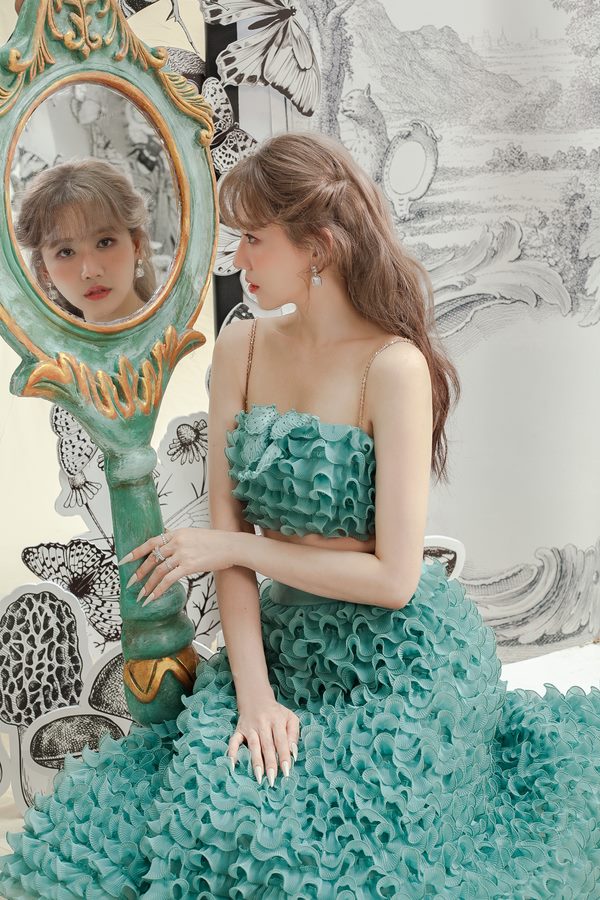 Đến style set áo crop top và đầm càng chứng minh được vóc dáng có thể “cân” được mọi trang phục của chủ nhân hit “Anh cứ đi đi”. Trang phục này tô đậm thêm nhan sắc lộng lẫy của Hari Won.