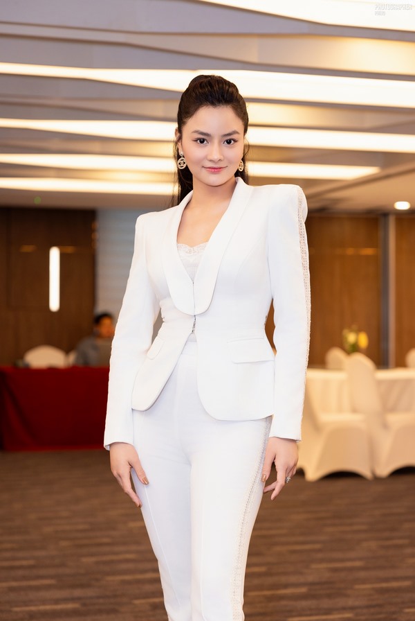 Người đẹp 8X chọn bộ vest trắng lịch lãm, khác với hình ảnh quyến rũ thường thấy. Vũ Thu Phương cho biết tùy vào từng sự kiện mà cô chọn trang phục phù hợp. Đây cũng là cách sao phim Cô nàng bất đắc dĩ thể hiện sự chuyên nghiệp, tôn trọng dành cho các đối tác của mình.
