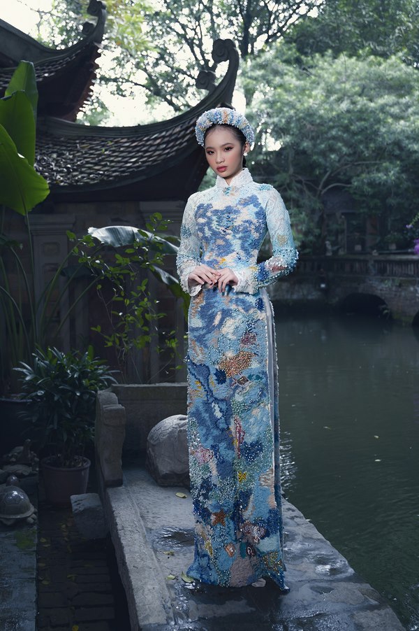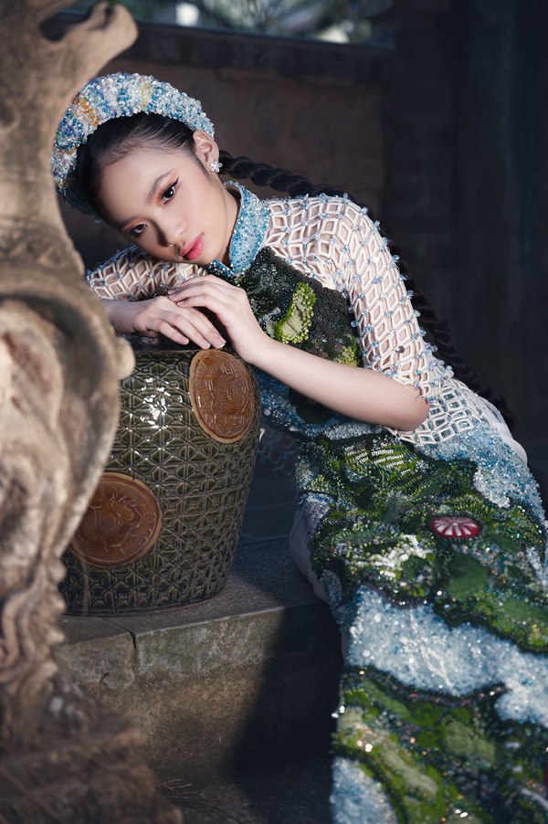 Tiếp tục khiến khán giả phải ấn tượng khi Quán quân Teen Models 2022 lựa chọn khoác lên mình chiếc áo dài dáng cổ yếm với phong thái đầy trưởng thành, quyến rũ. Những hình ảnh làng quê được đính kết tỉ mỉ trên thân áo càng làm tôn lên vẻ đẹp nền nã của Bảo Hà khi thực hiện shoot ảnh cuối lúc chiều tàn.