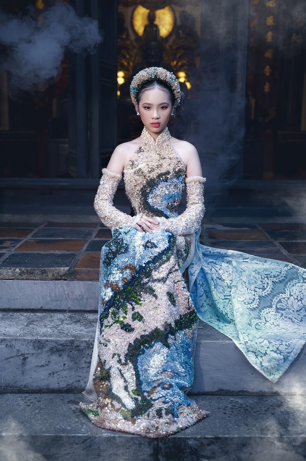 Khoác trên mình tà áo dài với phần cắt xẻ ở vai cùng những họa tiết mang hình ảnh non được đính kết đầy sống động đã giúp nàng mẫu nhí khoe khéo bờ vai thon cùng sắc vóc nuột nà. Nét dịu dàng, mong manh của Bảo Hà mang chút đối lập với vẻ uy nghiêm nơi cửa phủ nhưng lại hòa hợp một cách lạ kỳ.