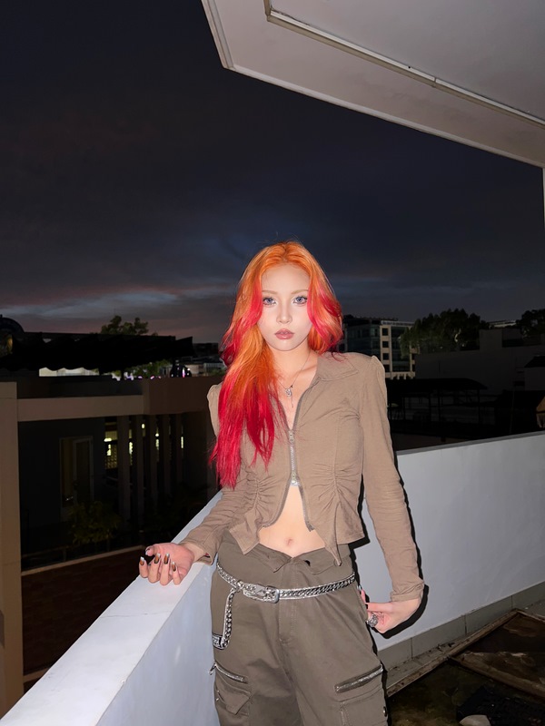 Một lần khác, Yee Pink lại làm mới bản thân khi nhuộm mái tóc cam cháy, uốn sóng nhẹ nhàng, tôn lên làn da trắng sáng và gương mặt chuẩn hot girl. Vẫn là outfit với quần jean và thắt lưng bản to, nhưng Yee Pink diện một chiếc áo ba lỗ croptop làm nổi bật hình thể nóng bỏng của mình.