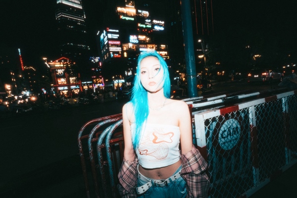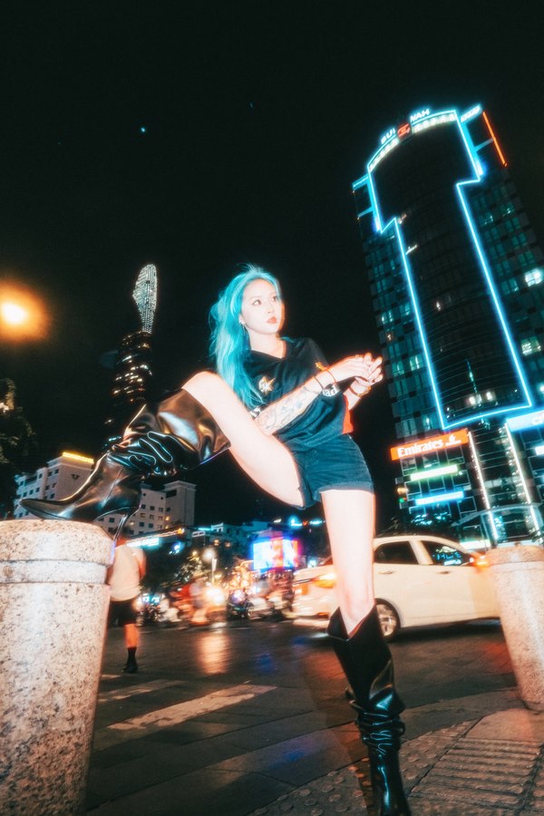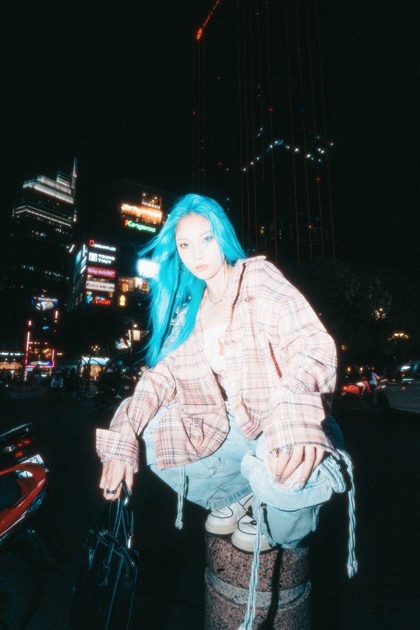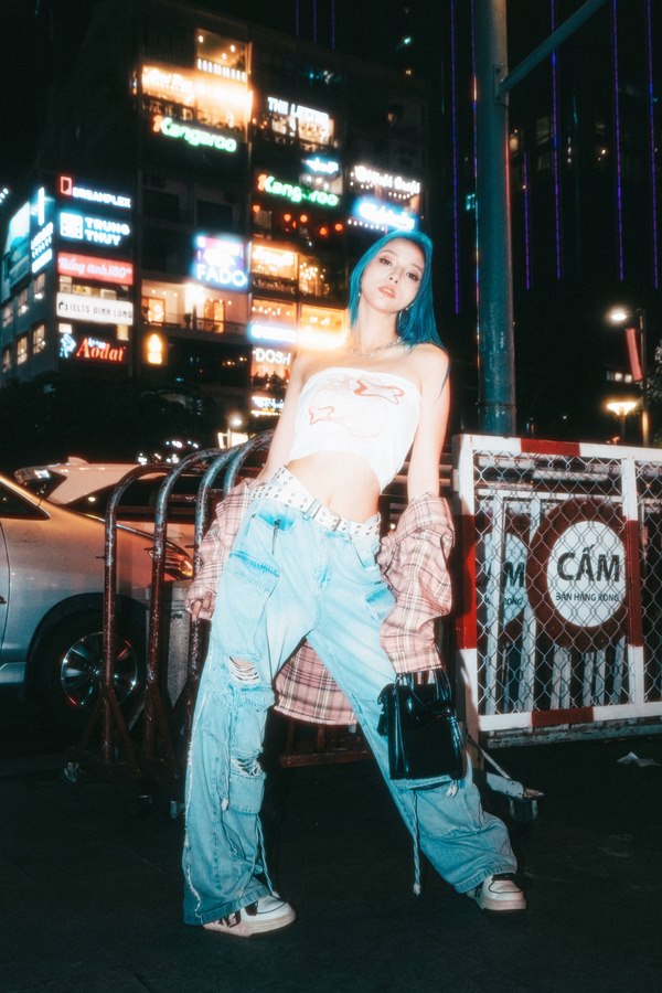 Trong loạt ảnh đường phố, Yee Pink đầy cá tính với mái tóc xanh rực rỡ. Outfit cô chọn là áo sơ mi ca rô năng động khoác bên ngoài croptop, khoe trọn vòng eo thon gọn, săn chắc. Chiếc quần jean túi hộp đi kèm thắt lưng bản to bên dưới càng làm nổi bật gu ăn mặc phong cách của cô.
