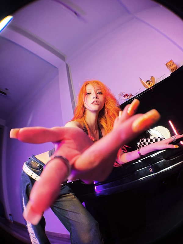 Không chỉ gây ấn tượng với những màu tóc rực rỡ, Yee Pink cũng rất xinh đẹp khi thử một tone màu trầm như nâu trầm ánh khói. Cô diện chiếc áo được cut-out năng động với vạt áo hình tam giác tôn eo, bên ngoài là chiếc sơ mi trắng được khoác hờ khoe trọn bờ vai thon và xương quai xanh thanh mảnh. Phụ kiện là khuyên tai bản to cùng chiếc tai nghe chụp tai truyền tải đúng phong cách của một “dancer” trong thước ảnh.